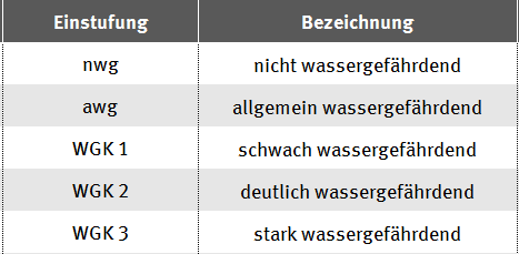 In Deutschland regelt die Verordnung über Anlagen zum Umgang mit wassergefährdenden Stoffen (AwSV) den Schutz von Grund- und Oberflächengewässern. Jeder Stoff und jedes Gemisch wird nach einem festen Bewertungssystem in eine von drei Wassergefährdungsklassen (WGK 1 bis 3) eingestuft – oder als „nicht wassergefährdend“ klassifiziert.